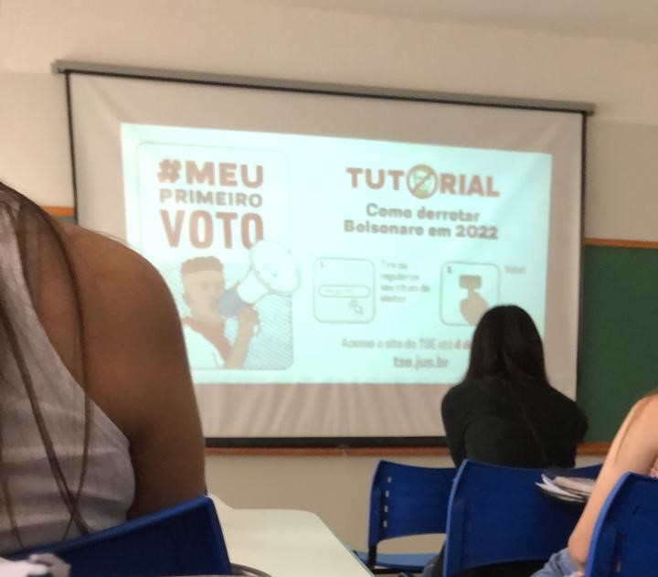 Ao lado da ‘hashtag’ uma outra chamada reforça a ligação partidária do conteúdo apresentado em sala de aula: A palavra em destaque ‘Tutorial’ tem a letra ‘o’ trocada por uma caricatura do presidente Bolsonaro subposta com marca das placas de trânsito indicativas de proibição. Abaixo vem a inscrição “Como derrotar Bolsonaro em 2022” seguido de figuras indicativas do voto eletrônico e a informação para acessar o site do TSE.