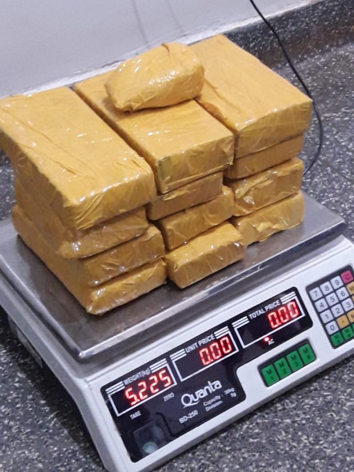 No decorrer da fiscalização, foi abordado um jovem de 23 anos, que transportava uma mochila cor preta. Em vistoria na mochila, foram encontrados 5,225 kg de maconha e 0,990 gramas de bucha de maconha.