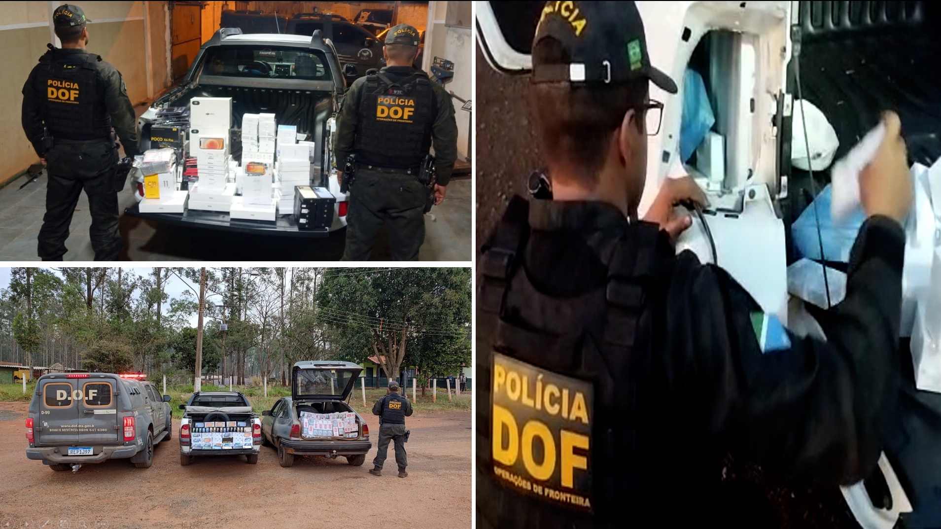 Na primeira ocorrência dos policiais do DOF na MS-162 resultou na apreensão de 59 celulares, quatro estabilizadores, dois Drones, 23 receptores, duas lentes canon, 18 memórias SSD, 16 relógios de pulso, 10 adaptadores, quatro tablet’s, 15 HD’s externo, três mouses e 25 fones de ouvido, em um veículo Renault/Oroch. Os materiais avaliados em aproximadamente R$ 250 mil foram encaminhados à Polícia Federal de Dourados.