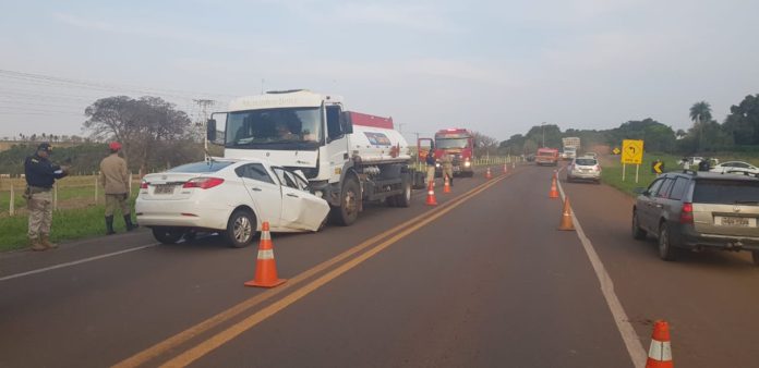 O acidente entre um veículo de passeio Hyundai HB20 Sedan e um caminhão de transporte de combustível, aconteceu por volta das 15 horas desta segunda-feira (29), no km 372 da BR-262, em Terenos (MS).