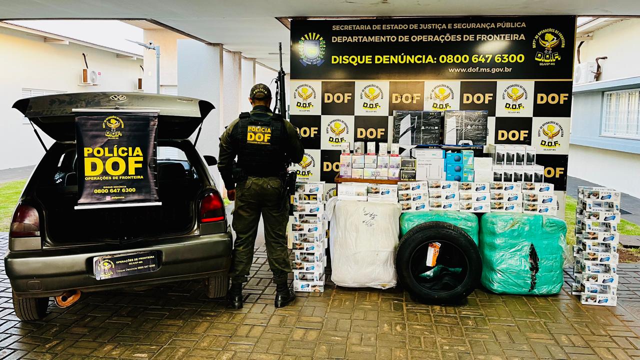 Policiais militares do Departamento de Operações de Fronteira (DOF) apreenderam na tarde desta terça-feira (03/06), na MS-164, em Maracaju, um veículo VW Gol transportando produtos de contrabando e descaminho. A equipe prendeu um homem de 33 anos e uma mulher de 46 anos.