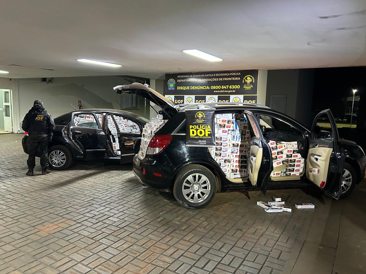 Os policiais conseguiram interceptar os automóveis após alguns quilômetros de monitoramento. O GM Captiva e o Fiat Linea transportavam, juntos, 3.500 pacotes de cigarros de origem estrangeira. No interior do primeiro veículo, os agentes localizaram 1.900 pacotes; no segundo, outros 1.600.