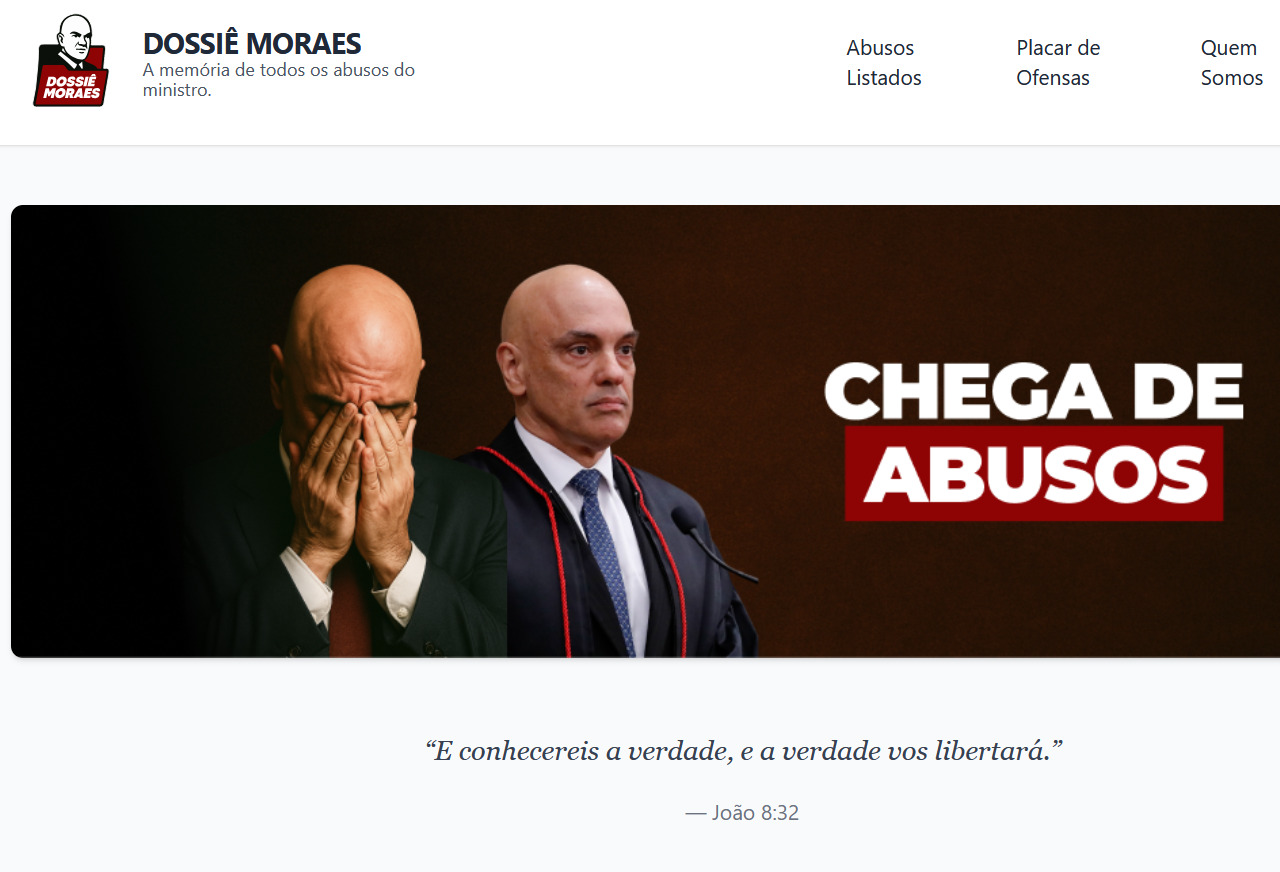 - Linha do Tempo: exibe cronologicamente os atos atribuídos a Alexandre de Moraes, desde o Inquérito das Fake News (2019) até episódios recentes, como gestos durante eventos públicos.