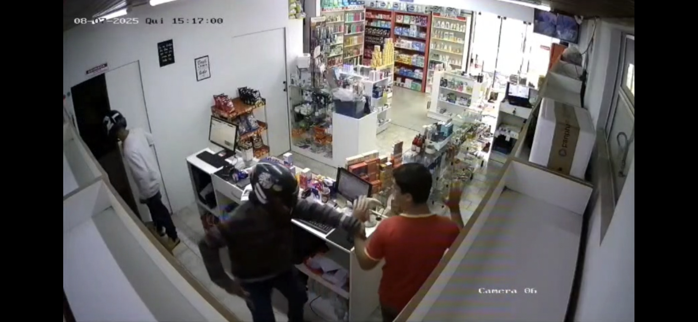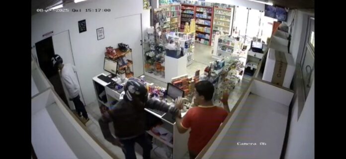 Dois homens armados, usando capacetes invadiram uma farmácia, localizada na esquina da Rua Comandante Cardoso, no bairro da Granja, na tarde desta quinta-feira (7). Eles renderam um funcionário, levaram o dinheiro do caixa e tudo que conseguiram pegar.
