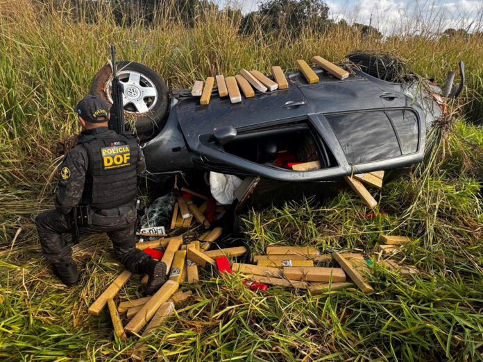 Policiais militares do Departamento de Operações de Fronteira (DOF) apreenderam nesta quarta-feira (20/08), em Ponta Porã, 857 quilos de maconha transportados em um veículo VW Golf que capotou durante a fuga.