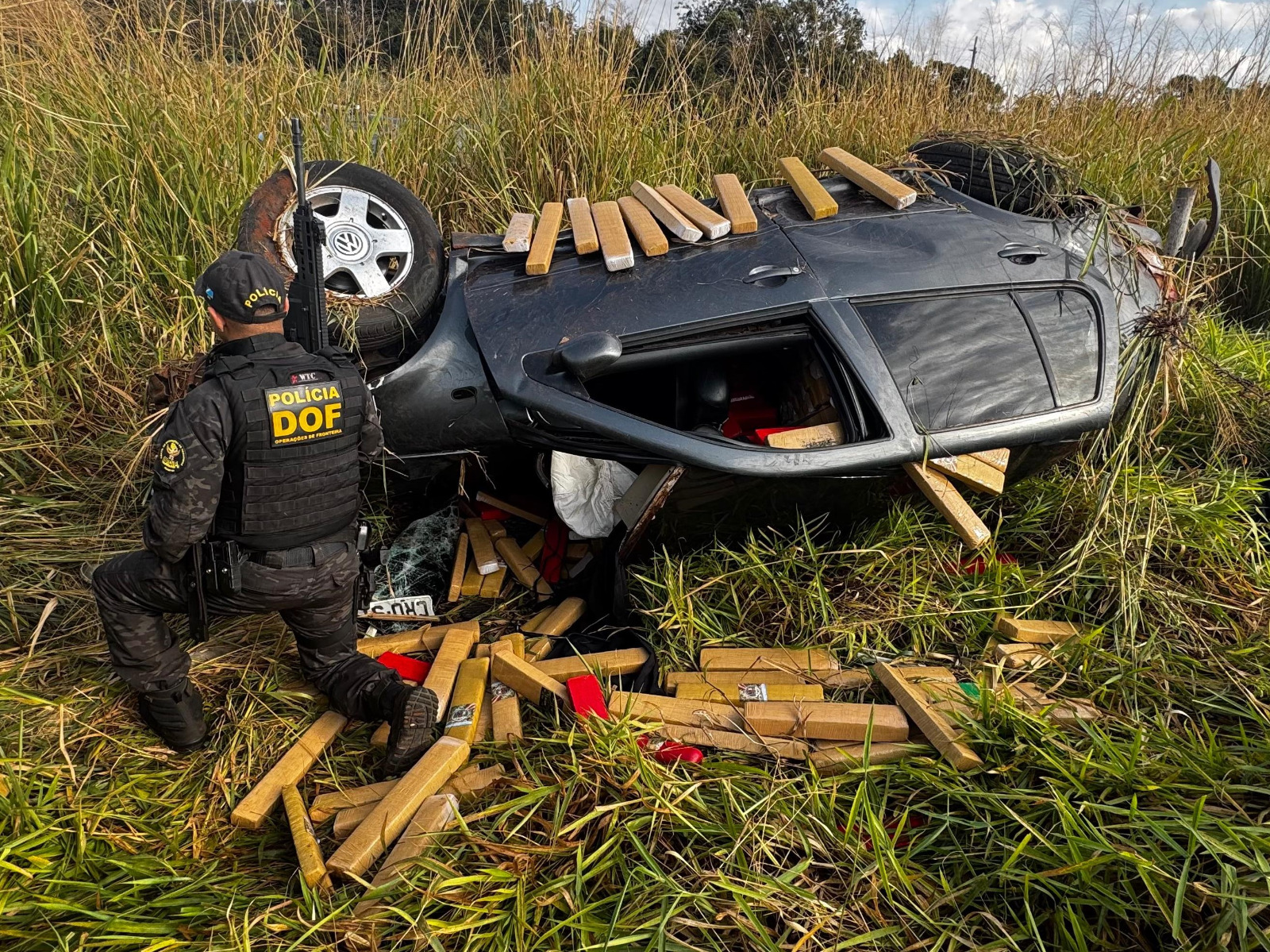 O condutor transitava pela MS-382, em área rural do município, quando desobedeceu ordem de parada e tentou escapar. Após alguns quilômetros, perdeu o controle, capotou o carro e fugiu a pé.