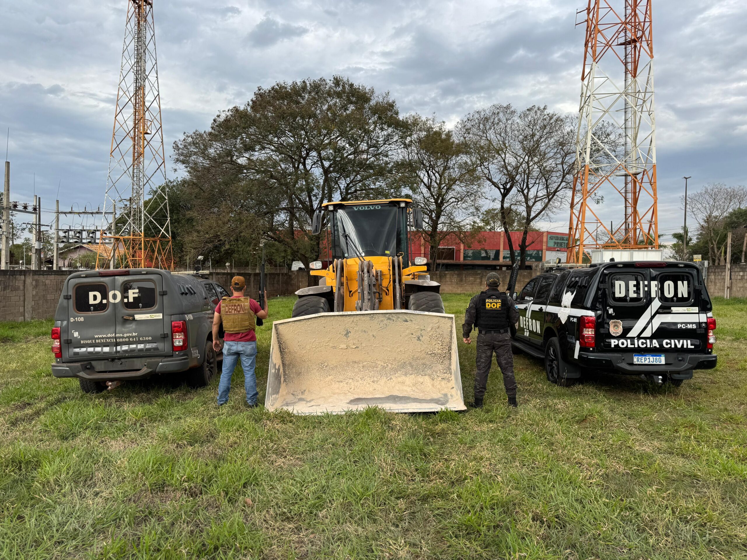 Os policiais verificaram que as etiquetas de identificação eram falsas e confirmaram que se tratava da pá carregadeira furtada em janeiro de 2024, no município de Caarapó.