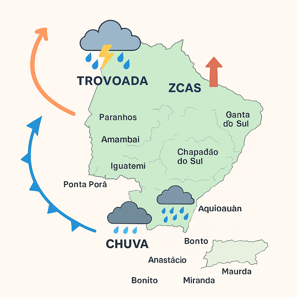 No dia 1º de novembro, as chuvas se espalham por Bonito, Jardim, Guia Lopes, Nioaque e Maracaju. No mesmo período, Chapadão do Sul, Costa Rica, Cassilândia e Paranaíba, no norte do estado, também recebem trovoadas e volumes elevados de chuva. A previsão se mantém para o dia 2 de novembro.
