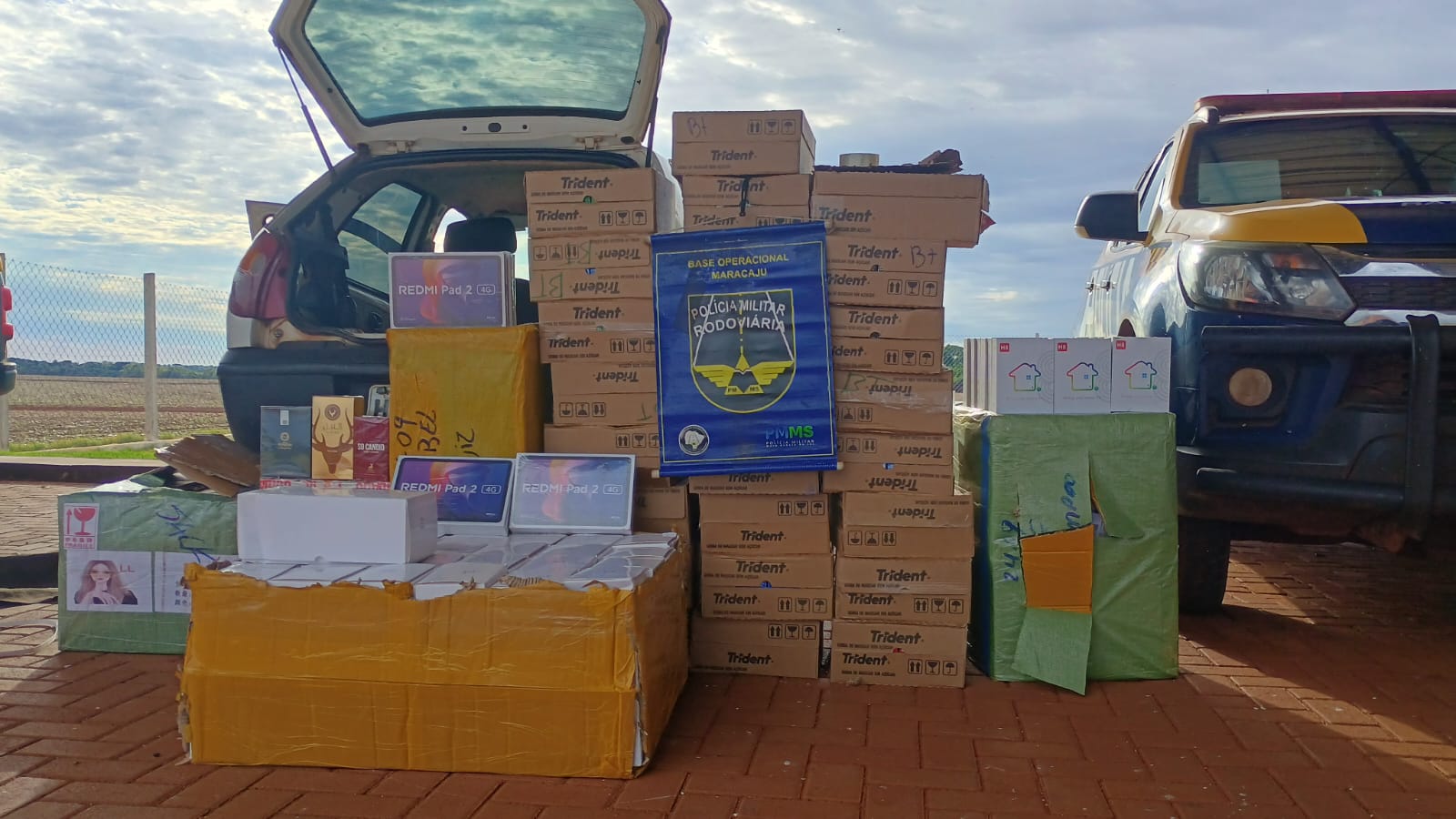 Durante a vistoria, os policiais constataram que o veículo transportava produtos estrangeiros sem comprovação aduaneira. A carga configurou crime de descaminho. Entre os itens apreendidos estavam 25 caixas de chicletes Trident, 17 aparelhos receptores de TV marca H8, 5 tablets Xiaomi Redmi Pad 2, 4 volumes de óculos e 1 volume de perfumes de marcas variadas.