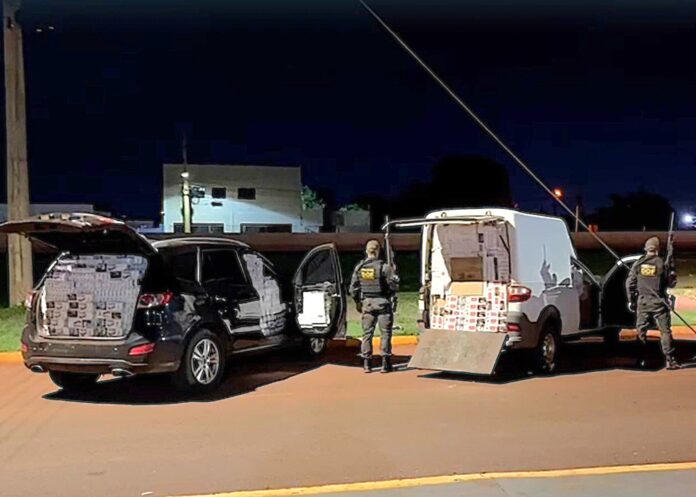 Durante diligências, os policiais localizaram os dois automóveis sem ocupantes, e iniciaram buscas na região sem localizar suspeitos. No interior dos veículos, a equipe encontrou seis mil e quinhentos pacotes de cigarros do Paraguai, e constatou que o Hyundai Santa Fé possuía registro de roubo em São Paulo.