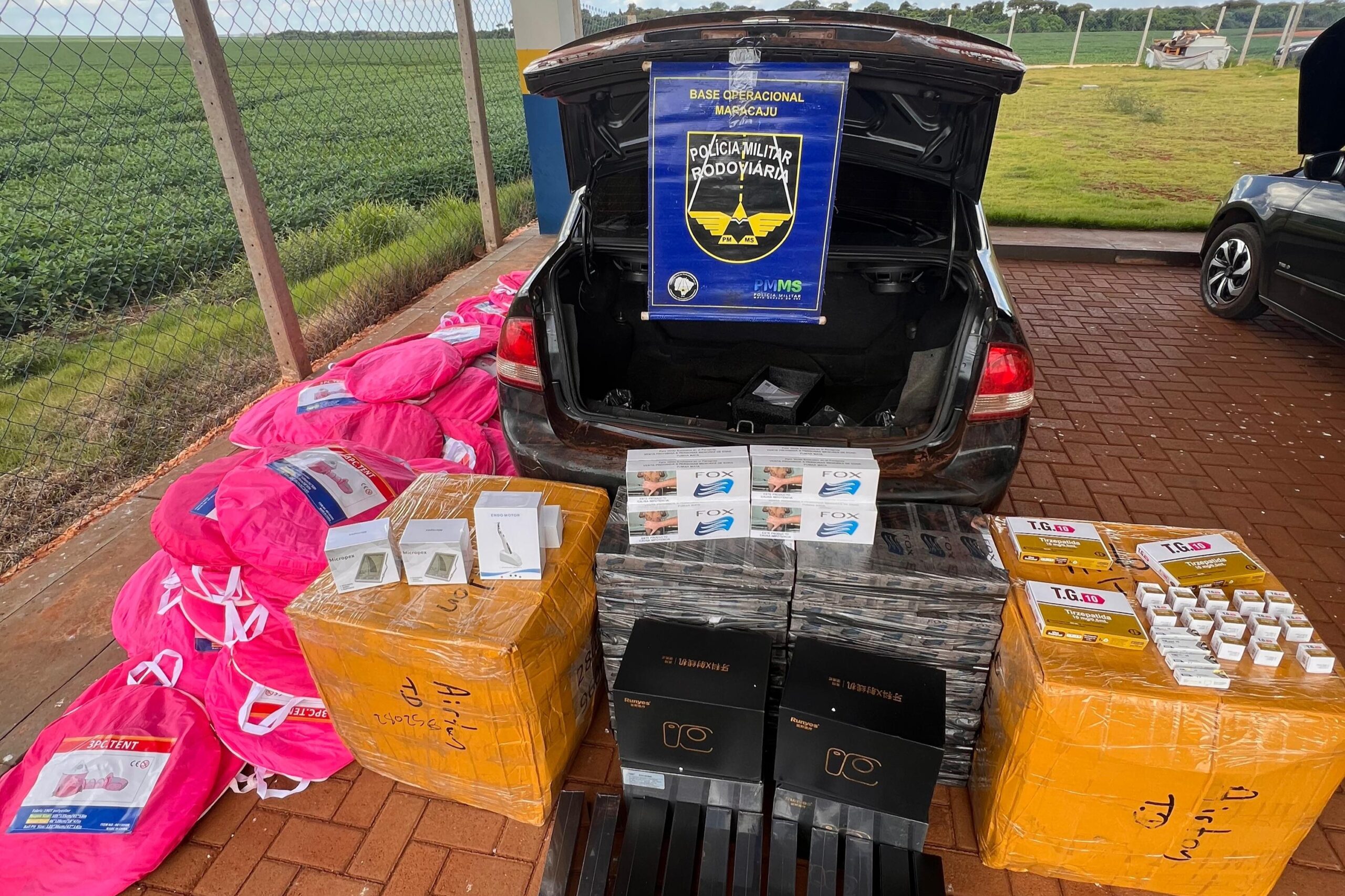 Na segunda abordagem, os policiais localizaram 150 pacotes de cigarros, 80 barracas infantis, volumes de óculos, equipamentos odontológicos que incluíram sensores de raio X, localizadores apicais, scanners intraorais e motor endodôntico, além de 20 unidades de medicamentos para emagrecimento de origem estrangeira, entre eles tirzepatida e Tirzec. A equipe reuniu o material para registro e controle.