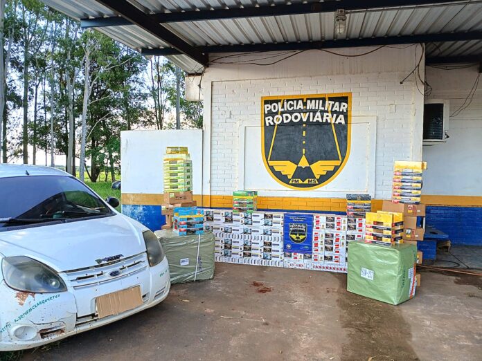 Os policiais executaram vistoria no interior do automóvel e encontraram mercadorias de origem estrangeira sem documentação fiscal. A carga reunia 500 pacotes de cigarros, 375 unidades de essência para narguilé e volumes com óculos. A equipe caracterizou a ocorrência como contrabando.
