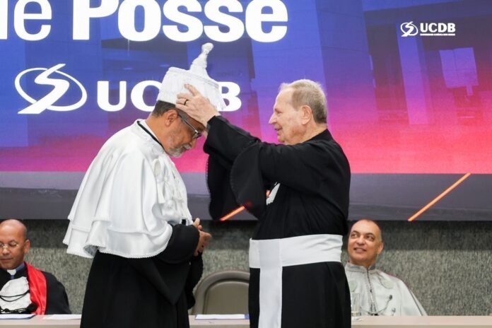 Em seguida, o Inspetor dirigiu-se ao novo Reitor: “Padre Hermenegildo, para nós, Padre Gildo, hoje, com coração livre e sereno, com jeito paciente e um estilo brincalhão, leve e acolhedor na convivência cotidiana, assumes a Reitoria da Universidade Católica Dom Bosco. Caro irmão, isto não é meramente ocupar um cargo de gestão administrativa e pedagógica; é acolher um convite para caminhar em solo sagrado. O solo da formação humana e cristã, como bem nos ensinou São João Bosco. Antes de sermos uma estrutura de prédios e currículos, somos uma comunidade de pessoas que buscam o bem dos jovens. Vivemos tempos de grandes transformações digitais e sociais. No entanto, a identidade carismática salesiana nos dá a segurança necessária para inovar sem perder o rumo. Nosso estilo não é de quem apenas ensina conteúdos, mas de quem acompanha vidas. Dom Bosco fez muito, com tão pouco, respondendo aos desafios de sua época. Assim devemos fazer muito, com tão pouco, respondendo aos desafios da nossa época, de nossa sociedade. P. Gildo, que o serviço de animação e governo seja reflexo desse acompanhamento. Que a UCDB não seja apenas um centro de excelência, mas que seja, acima de tudo, uma casa que acolhe, uma paróquia que evangeliza, uma universidade que prepara para a vida e um pátio que, no encontro cotidiano, possamos cultivar amizades”.