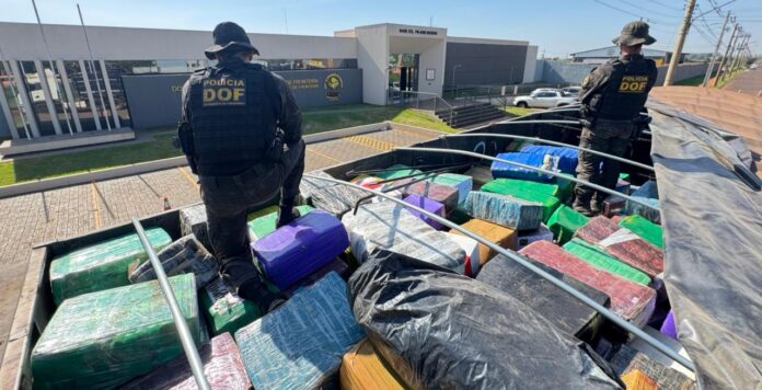 Policiais do Departamento de Operações de Fronteira e da Delegacia de Repressão aos Crimes de Fronteira apreenderam 11.450 quilos de maconha nesta quarta-feira (04/03), em Mundo Novo. A droga seguia em uma carreta que transportava soja e a operação resultou na prisão de três homens e na apreensão de três veículos de carga.