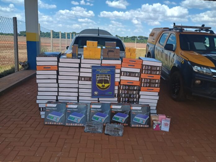 Poucos minutos depois, por volta das 12h15, os policiais abordaram um Fiat Siena com placas de Curitiba. O veículo era conduzido por um homem de 51 anos. Dentro do automóvel, os agentes encontraram 200 baterias para celular, 100 balanças digitais, 27 aparelhos celulares e 5 perfumes sem comprovação fiscal.