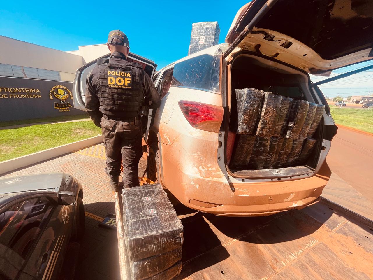 Policiais militares do Departamento de Operações de Fronteira (DOF) apreenderam nesta quarta-feira (22/04), em Sete Quedas, 1.900 quilos de maconha distribuídos em 81 fardos dentro de uma Toyota SW4 roubada em Joinville, Santa Catarina. O condutor abandonou o veículo em movimento e fugiu a pé para uma área de mata, e as buscas realizadas na região não resultaram em nenhuma prisão. A carga foi avaliada em aproximadamente R$ 4 milhões.